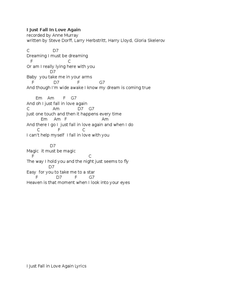 I Just Fall In Love Again Lyrics : Baby, you take me in your arms and though i'm wide awake i know my dream is coming true. I Just Fall In Love Again Lyrics - Classic country music lyrics home | anne murray lyrics.